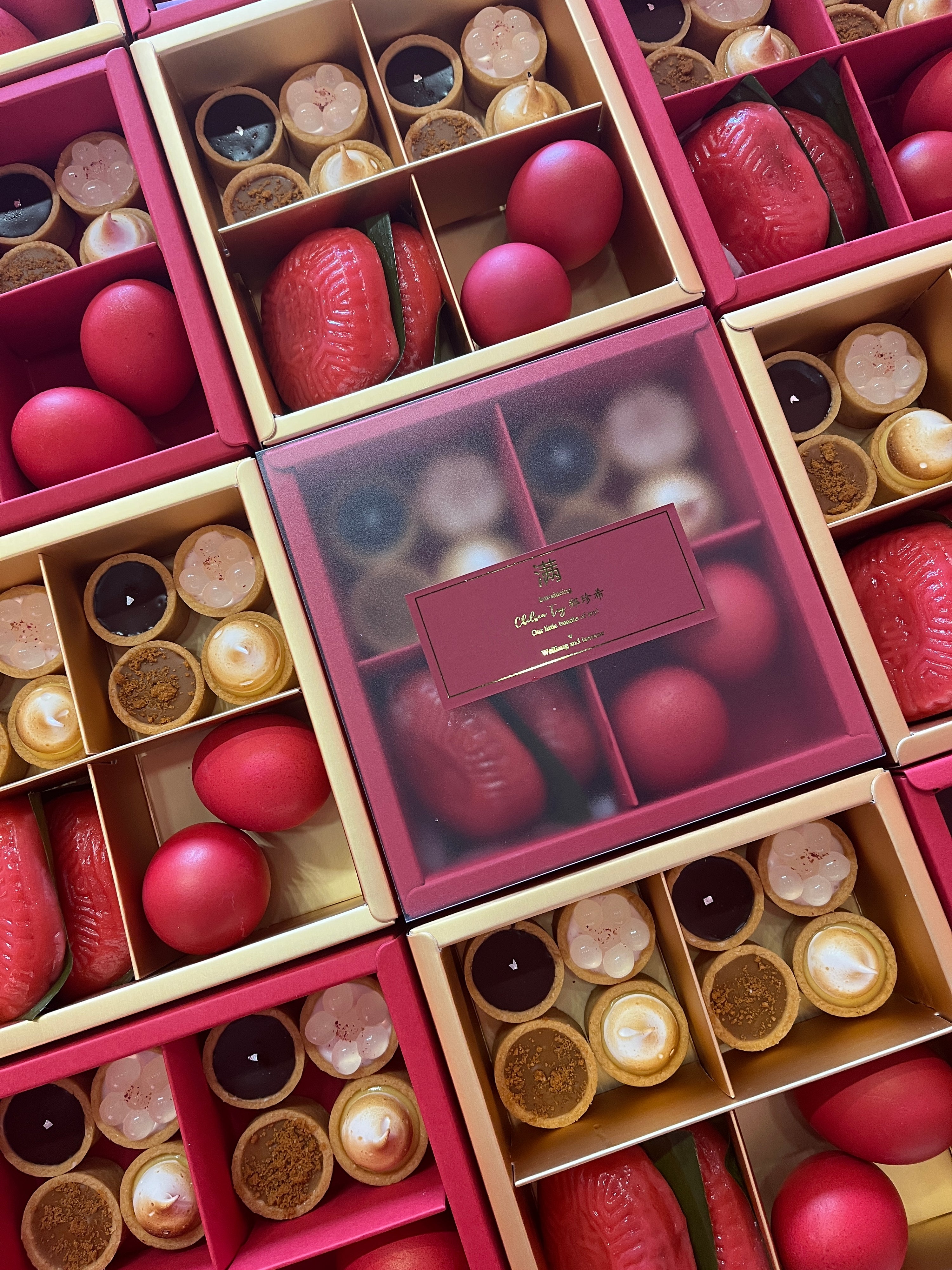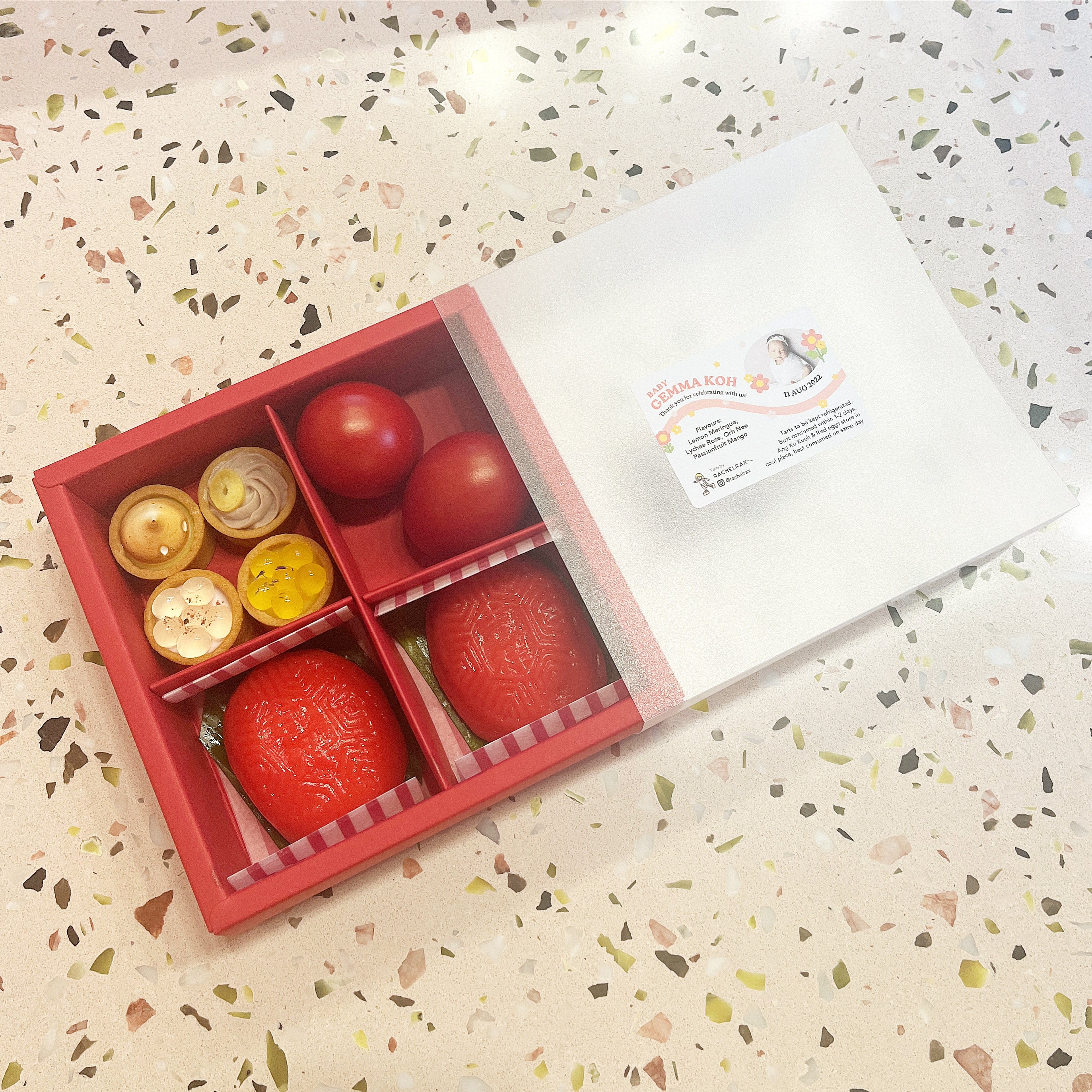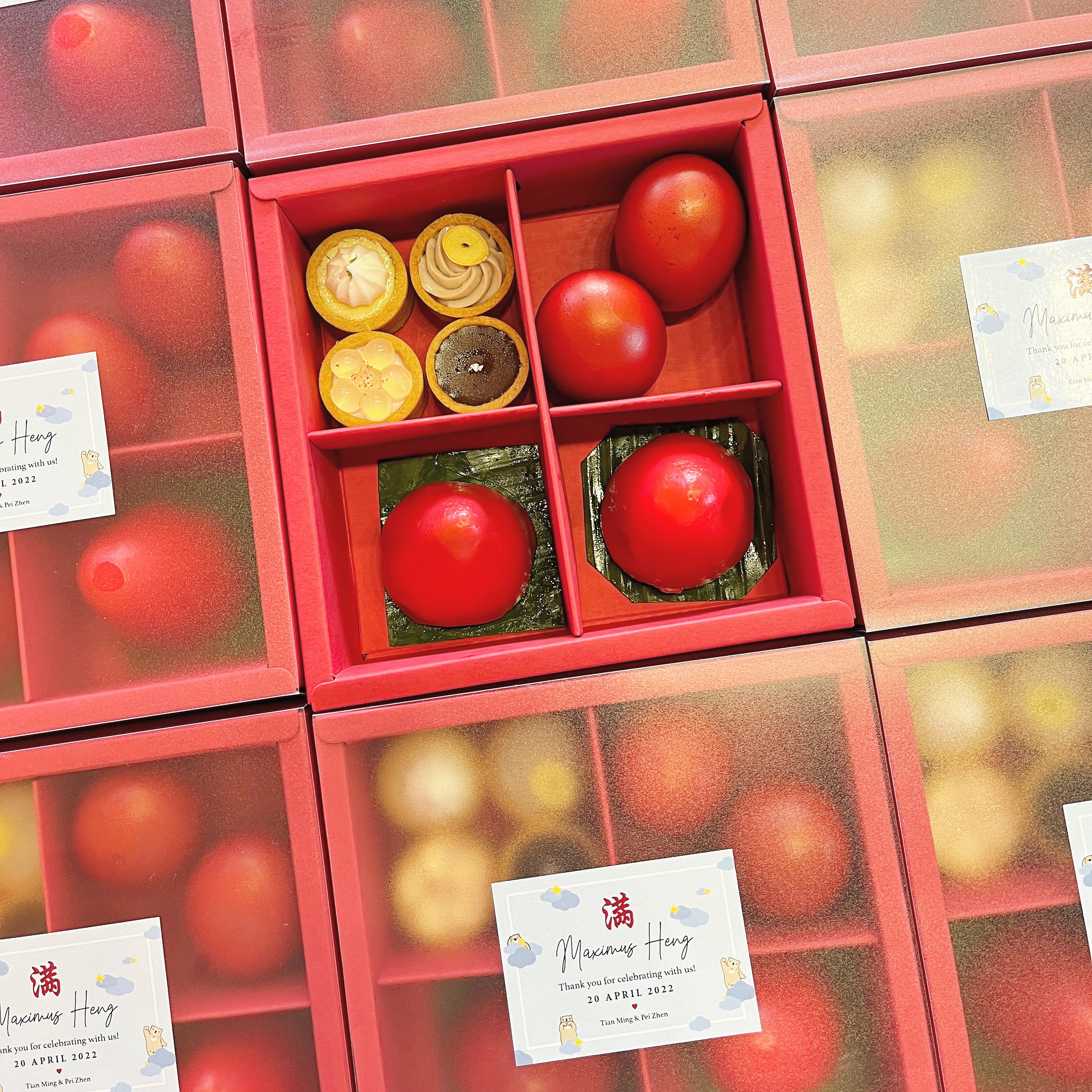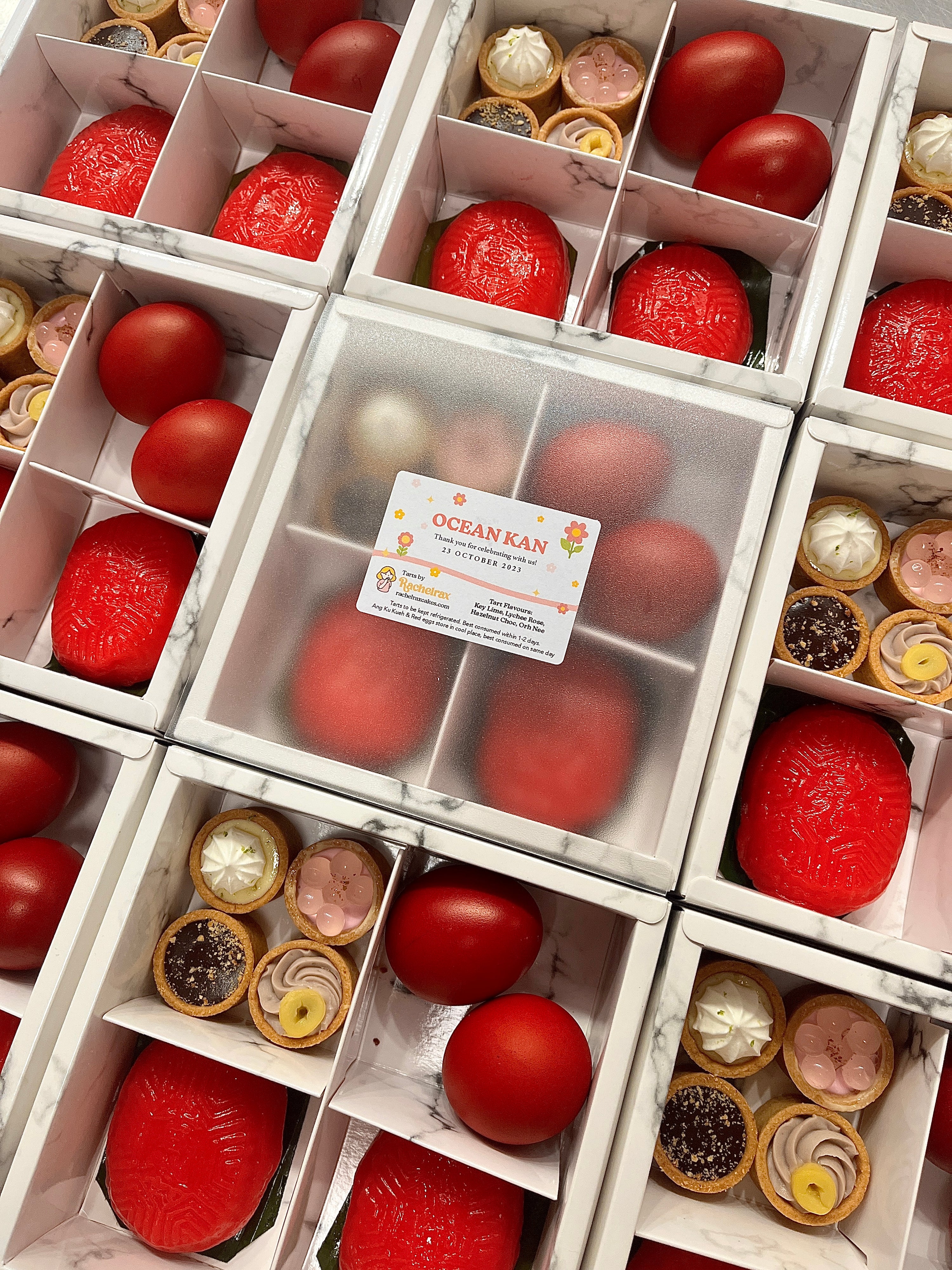 Our mini tarts full month boxes can be customised to include your desired items such as red eggs, ang ku kueh, ang ee, etc.
