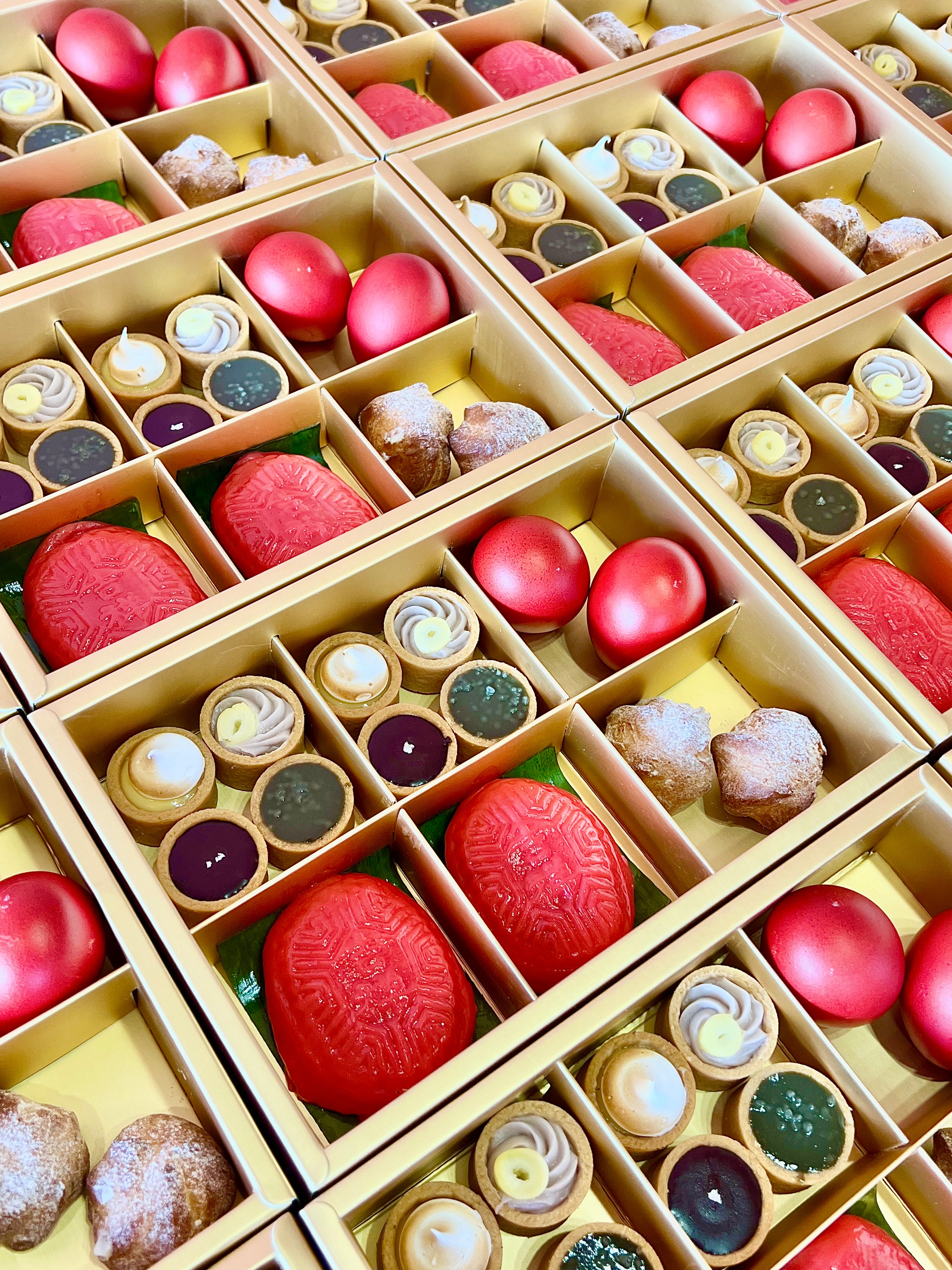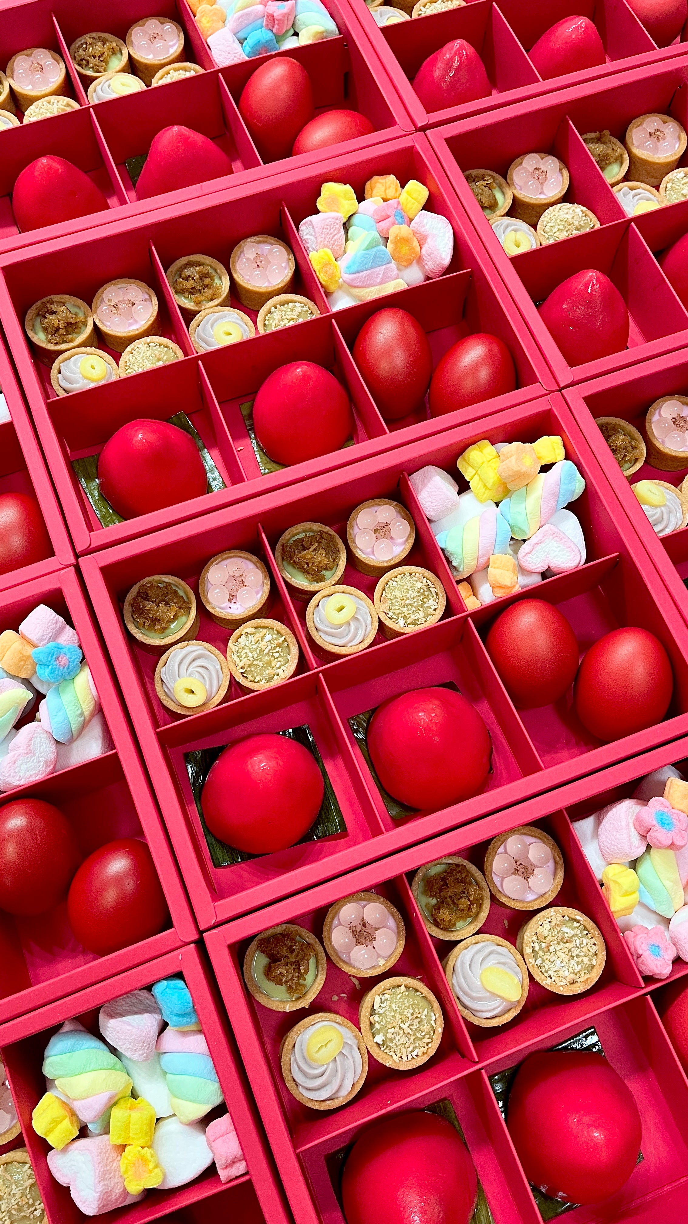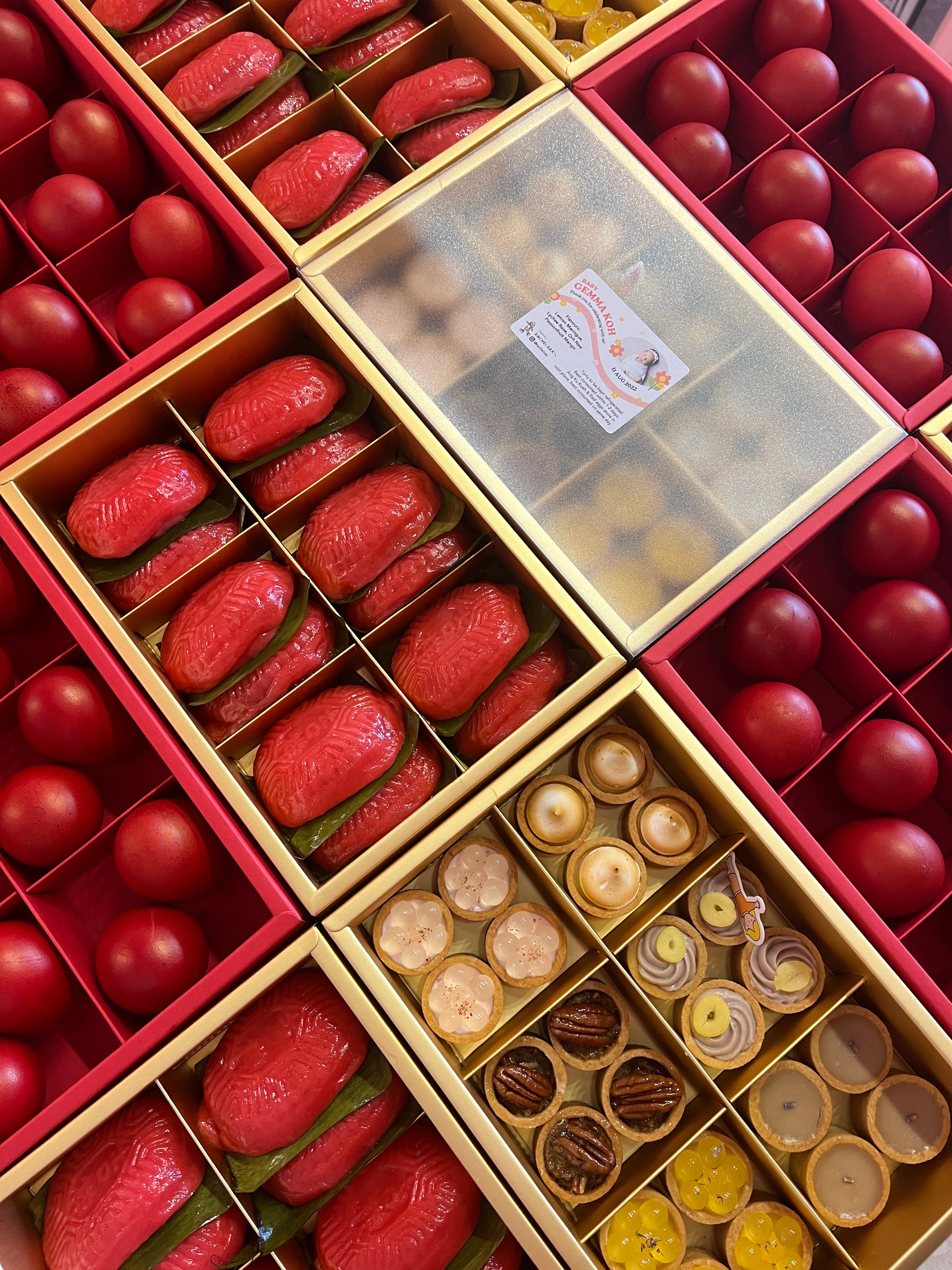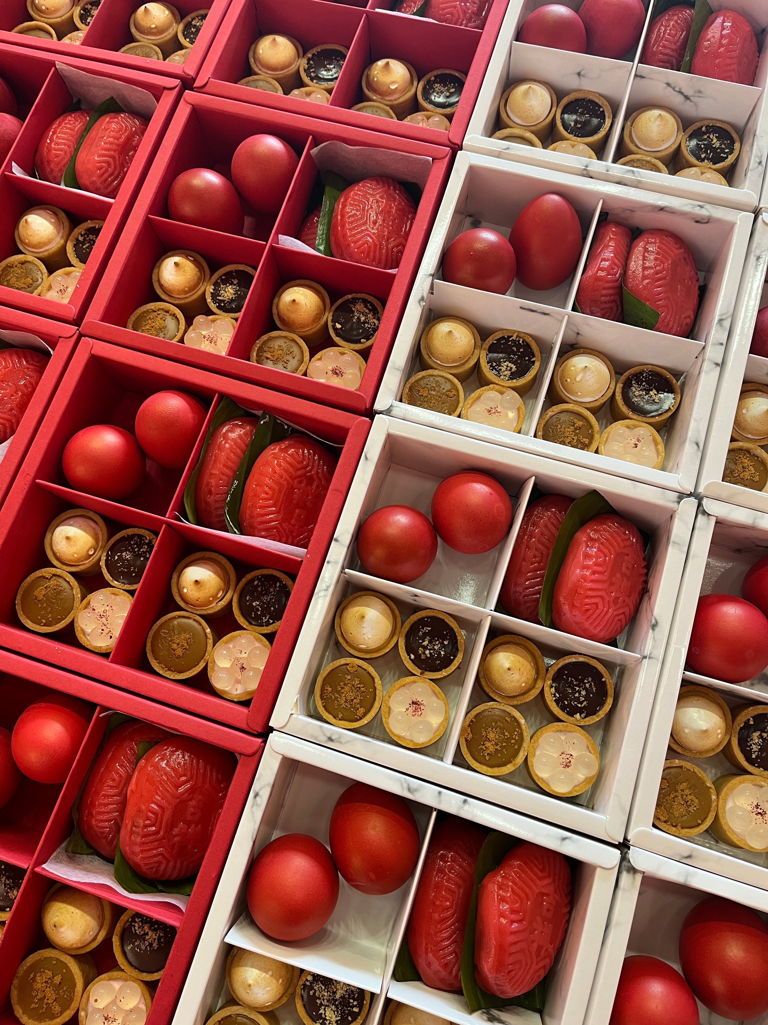 Our mini tarts full month boxes can be customised to include your desired items such as red eggs, ang ku kueh, ang ee, etc.